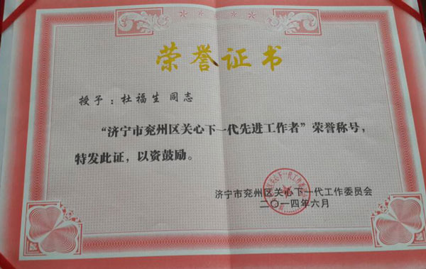 經典集團總經理杜福生榮獲“兗州區關心下一代先進工作者”榮譽稱號